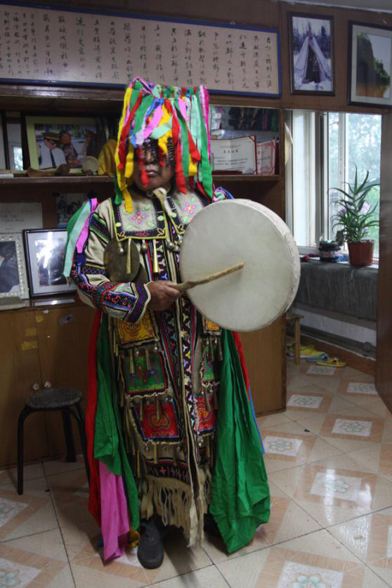 冬天穿的鞋是“奇哈密”和“溫得”,“奇哈密”是用狍脖皮或犴皮做靴底,用狍腿皮拼縫成靿的短靴?!皽氐谩笔怯寐够蜥砥ぷ龅?,鹿或犴腿皮拼縫成靿的長靴?!皽氐谩币?yàn)殪壐撸齑┲颢C不易灌雪。這兩種靴子都要用冬季絨毛狍皮做成的襪子配套穿用,暖和跟腳,踩在雪地上沒有聲響。夏天一般穿“奧勞其”,是一種皮底布靿短靴。“考呼落”,是用冬季絨毛狍皮縫制的二指手套,掌面腕部留一縫口,手從縫口中伸出,手套仍護(hù)在手背上,既使在零下40度的嚴(yán)寒中處理獵物,也不用擔(dān)心手被凍壞。還有一種五指狍皮手套,背面正中繡花、蝶等中心圖案,五指的關(guān)節(jié)和指甲處繡出各種小型圖案,然后用連理枝將中心圖案和關(guān)節(jié)、指甲圖案連為一體,中心圖案代表手掌,手指圖案代表關(guān)節(jié)和指甲,連理枝代表骨骼和血脈(圖為越來越鮮見的薩滿服飾,吳雅芝供圖)。
