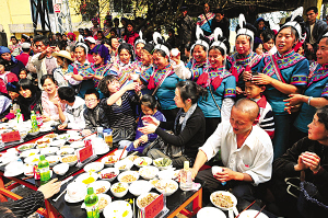 “中國(guó)紅河·元陽(yáng)2009年哈尼梯田文化旅游節(jié)”上,哈尼族群眾擺下360桌、近0.5公里長(zhǎng)的哈尼族長(zhǎng)街宴,用最隆重的禮儀和風(fēng)味美食,迎接來(lái)自海內(nèi)外的賓客。