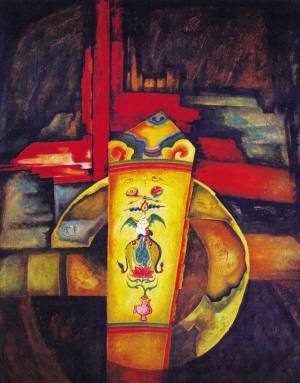 我以前所結(jié)識的一批納西族畫家差不多都是上世紀(jì)四五十年代出生的,他們大多接受過美院等高等藝術(shù)院校的教育,具有堅(jiān)實(shí)的繪畫功力,有相同的美學(xué)見解和共同的探索形成的藝術(shù)追求。它一出現(xiàn)就以其獨(dú)特的美學(xué)傾向和特殊的藝術(shù)魅力引起世人的關(guān)注。而和向東是上世紀(jì)70年代出生的青年畫家,他原來就讀于浙江大學(xué)的藝術(shù)設(shè)計(jì)專業(yè),只因迷上美術(shù)學(xué)理論而走上了創(chuàng)作之路,沒有學(xué)院派的背景。他的家鄉(xiāng)云南麗江現(xiàn)在已是聲名鵲起,納西族東巴文化作為世界記憶遺產(chǎn)已聞名海內(nèi)外。作為年輕一代的納西族畫家又該怎么表現(xiàn)東巴文化呢?這個(gè)學(xué)藝術(shù)設(shè)計(jì)的年輕人以設(shè)計(jì)師的獨(dú)特眼光和思維,一開始就與“現(xiàn)代東巴繪畫派”的中年畫家群體拉開了距離。其作品在保留古老的東巴繪畫藝術(shù)的基礎(chǔ)上,在作品中運(yùn)用書寫東巴經(jīng)卷的各種形象和文字符號。用當(dāng)代人的思維觀念和審美意識,運(yùn)用油畫的技法來表達(dá)。畫面大多用平面設(shè)計(jì)的構(gòu)成原理,以裝飾性的、形式感極強(qiáng)的、既寫實(shí)又抽象的手法表現(xiàn)出原汁原味的納西文化。即使拋開作品主題內(nèi)涵,依然可以從他的作品里感受到一種神秘、古樸、深沉的歷史基調(diào)。因4年前他的創(chuàng)作是在平面設(shè)計(jì)為主的業(yè)余時(shí)間里完成的,而真正投入精力進(jìn)行專業(yè)創(chuàng)作是近兩年的事,因此,他現(xiàn)在處于學(xué)習(xí)、吸收、探索創(chuàng)作的過程中。