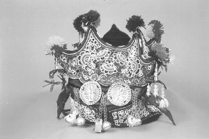 繡花帽由里外兩部分組成,素有“制做繡花帽,先做好襯套”之說(shuō)。即先按兒童頭徑大小制襯套,做法較簡(jiǎn)單,用染過(guò)的家織布做里襯,鋪上薄棉,外層為紅綢面,用線依次納緊,以防棉花下滑,縫成筒狀后,頂部用同樣的材料剪成四方形,與上部帽沿結(jié)構(gòu)相同即成。后部分較前部分復(fù)雜,先將染過(guò)的兩層家織布粘牢,表面貼上各色緞面,顏色自定。把圖樣拓在緞面上,剪下形狀不同的6片材料,把喜愛的圖案描繪在上面,接著用紡車紡出6根各4米長(zhǎng)的棉線,用吊砣逐根旋轉(zhuǎn)纏繞白色呢絨線,經(jīng)濃縮,每根僅得到1米左右線料,將這制好的精線按圖案盤弄,后以花針固定,再輔以其他色線刺繡成圖案點(diǎn)綴其間。把繡好的6片材料組合到襯套上,各片邊沿用黑白兩色線交替鎖邊,帽口用黑金絨布滾邊。此時(shí),帽頂?shù)模吨患饨怯貌噬€制做成圓球裝飾,外面四角下面懸吊白色珍珠串,末端垂著布制五角星。帽的周邊釘上銀制品,最后鑲上反光小圓點(diǎn)飾物似天上星星般光亮,給本就精致美觀的繡花帽增添了一道靚麗色彩,繡花帽就這樣在侗家女的手中誕生了。