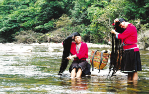 紅瑤女子的長(zhǎng)發(fā)平均在1.4米以上。村寨前后的河灘邊、泉水邊,就是她們的天然梳妝臺(tái)