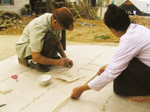 言談間,巖妞把制好的竹環(huán)放入早已畫好的同心圓圖案中的小圓上,只見(jiàn)竹環(huán)大小正好與小圓吻合。巖妞說(shuō),圖案外側(cè)的大圓便是擺放棉紙用的。接著,他把手中厚厚的幾張棉紙圍繞著已經(jīng)放入圖案中的竹環(huán)依次擺入,直至擺滿。在同心圓圖案的上側(cè),巖妞還畫了一個(gè)寬與同心圓圖案的直徑相符的矩形圖案,把棉紙鋪滿其中。巖妞說(shuō),這圖形就是“貢菲”的高度。制作的最后一道程序,是把棉紙用漿糊粘合起來(lái)。陰干后,一個(gè)“貢菲”就做好了。
