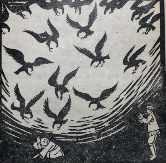 誰知笛聲一響,成群的兀鷹像是聽了誰的召喚,黑壓壓的一大片,直往奴隸主頭上飛來。奴隸主知道,只要鷹落下來,自己就沒命了,便急忙向娃發(fā)求饒道:“快把鷹叫開,你要啥我給啥!”娃發(fā)隨口說道:“給達卜達爾的塔吉克人每家十只羊,十頭牛,十峰駱駝,行嗎?”奴隸主連忙點頭:“行!行!要什么都給?!边@時,娃發(fā)又吹起了“鷹笛”,鷹群才飛走了。
