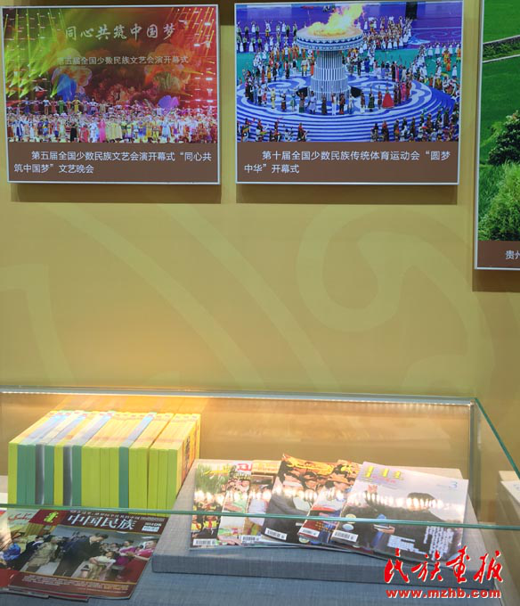 2017年,在“砥礪奮進(jìn)的五年”大型成就展上展出的《民族畫報(bào)》六種文版期刊以及《民族畫報(bào)》記者拍攝的反映民族工作成就的圖片
