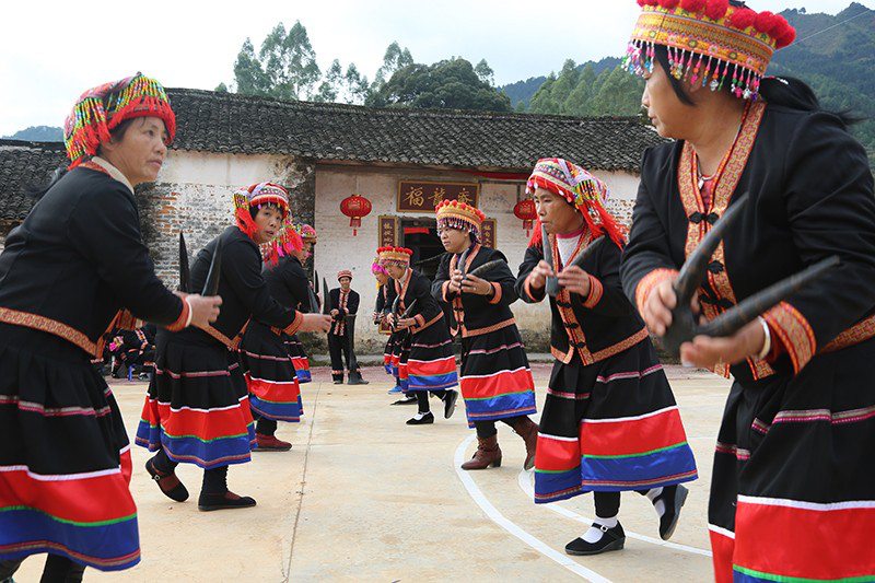 從舞者的動作中,我們不難發(fā)現(xiàn),扮演山羊的演員動作大多是圍繞長鼓設計的。歷經(jīng)千百年的演變,羊角長鼓舞已發(fā)展為集歌、樂、舞于一體的民間舞蹈,主要表現(xiàn)盤王及其子孫開辟瑤鄉(xiāng)的勤勞勇敢?,幖胰私ǚ?、祝壽、結婚生子、慶賀豐收以及祭祀等都要表演長鼓舞。每逢過大年、盤王節(jié)、耍歌堂等傳統(tǒng)節(jié)日,更是少不了這套讓人耳目一新的舞蹈。
