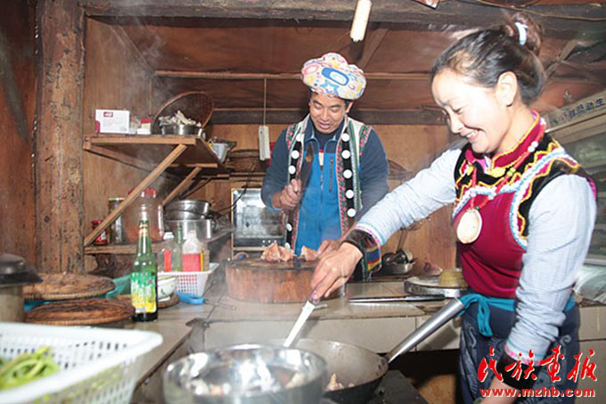 早上,老姆登村73歲的怒族老人斯普早早起來招呼兒子郁伍林、兒媳魯春花:“春節(jié)快放假了,客棧的生意會忙得不可開交,趁著現(xiàn)在客人不多,家里人先吃一頓團(tuán)圓飯吧?!彼蛊绽习樵缒赀^世,7個兒女中老五郁伍林在身邊照顧她。“過去在春節(jié)才能吃上一頓好飯菜,也要準(zhǔn)備很長時間,現(xiàn)在每天都有好吃的,天天在過年,多虧了黨的好政策?!闭f起今天的幸福生活,生在舊社會的斯普感慨萬千。