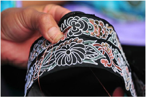 第四步是刺繡,包括三個(gè)環(huán)節(jié),即固定框架圖案、填芯和鑲邊。固定框架圖案,即用一根大針將馬尾線(xiàn)穿好,再用另一根稍小的針穿上同色絲線(xiàn),然后一邊用馬尾線(xiàn)在布面上鑲成各種圖案,一邊用穿有絲線(xiàn)的小針將圖案固定在布面上。填芯,即用各色絲線(xiàn)將固定好的圖案空隙部分填滿(mǎn)。鑲邊,即用橙色和黑綠色絲線(xiàn)在四周挑繡成鑲邊圖案。