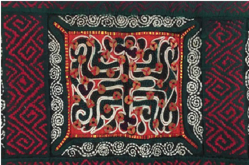 背兒帶上端的背帶手上繡有連續(xù)的螺絲紋。水族是南方的稻作民族,而螺螄是水田中常見(jiàn)的動(dòng)物,其繁殖屬性為多產(chǎn)。心靈手巧的水族女性將日常生活中的動(dòng)物形象,經(jīng)抽象變形而變成簡(jiǎn)練的紋樣,象征著生命的不斷繁衍。