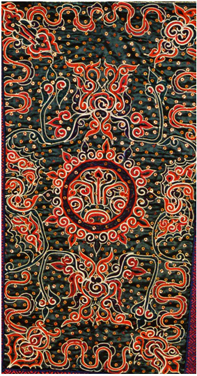 正因馬尾繡的工藝獨(dú)特,蘊(yùn)含著豐富的文化內(nèi)涵,2006年水族馬尾繡入選第一批國(guó)家級(jí)非物質(zhì)文化遺產(chǎn)名錄。而馬尾繡背兒帶更是將水族馬尾繡的藝術(shù)價(jià)值體現(xiàn)得淋漓盡致。民族文化宮博物館所藏的這件馬尾繡背兒帶,刺繡精美,展現(xiàn)了水族婦女?huà)故斓拇汤C技藝,是研究水族民俗、民風(fēng)、圖騰崇拜等民族文化的珍貴藝術(shù)資料。