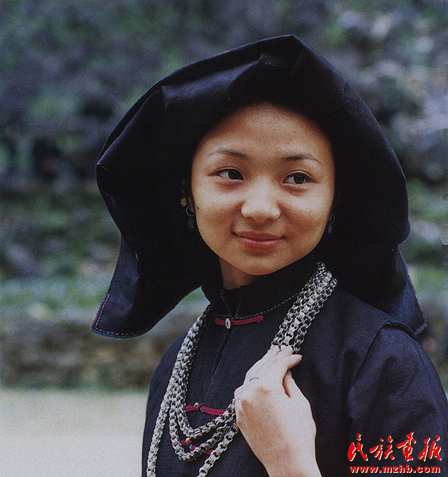 婦女的服飾更具特點(diǎn),無論老少,都喜歡穿右蓋大襟和葫蘆狀矮腳圓領(lǐng)的緊身短式上衣,下身以寬褲腳、大褲頭的褲子相搭配,腰系黑布做成的大圍裙,頭帶黑布大頭巾。其圍裙既寬且長,戴時(shí)能系周身有余,裙底垂掛到小腿下部,圍裙不僅作為裝飾,而且可以作為勞動(dòng)工具,遇趕圩或走親訪友和勞動(dòng)時(shí),可將圍裙底翻卷上來作成小包袱,用以包裝和盛裝物品。婦女頭巾都是一塊自己紡織染成的長條黑布,戴時(shí)先圍繞在頭上,然后翻折擺布成火棱形的圖樣,罩在整個(gè)頭上,再把頭巾的兩端分別垂掛到雙肩上,看上去樸素美觀。同時(shí)還可以當(dāng)做帽子遮蔭用。她們的衣邊、衣角、袖口、裙邊和頭巾的四邊都用紅布或黃布剪成小條以后鑲捆上去,有的則用紅、黃、藍(lán)色絲線繡成波浪形的線條,使黑中襯出紅、黃、藍(lán)色的線條來,清雅明亮,色彩協(xié)調(diào)。再加上頭發(fā)插著龍頭形的銀簪,頸項(xiàng)上帶有銀鏈或項(xiàng)圈,手帶銀圈、玉鐲,耳掛珍珠耳環(huán)等,使人一看,黑中閃艷,樸素之中亦有玲瓏之美,表現(xiàn)了她們獨(dú)特的審美觀。