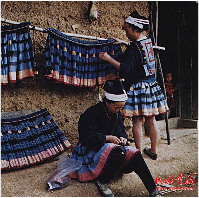 畫好的白布放進盛有牛膠和藍(lán)靛的缸里浸染7— 10天,當(dāng)布匹染成深藍(lán)色時拿出,再放入盛有草木灰的熱水中,用灰水將粘膏脫去,清水洗凈后晾干,就成了一塊有白色花紋的蠟染布。白褲瑤婦女在白色的花紋上繡上彩色的絲線,再把三幅繡有圖案的布連成一塊4米長的裙布,在裙腳邊上縫上一條手掌寬的黃色蠶絲,最后用2 條棉繩穿過裙頭勒緊,百褶裙就做成了。一條百褶裙從紡線到完成據(jù)說需要兩到三年的時間。