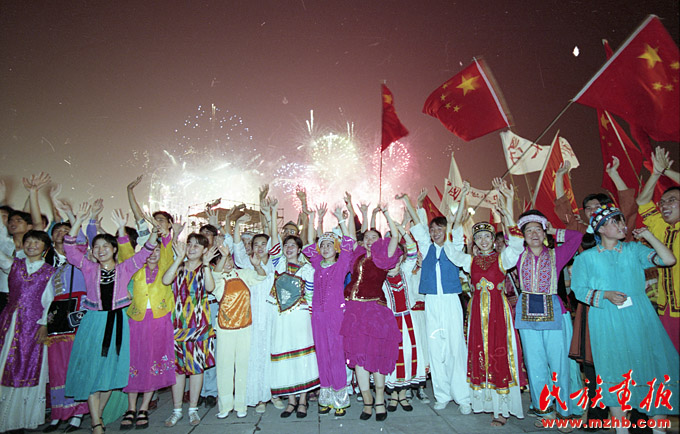 1997年7月1日零點,中華人民共和國國旗和香港特別行政區(qū)區(qū)旗在香港升起,經(jīng)歷了百年滄桑的香港回到祖國的懷抱,中國政府開始對香港恢復行使主權。香港回歸祖國,舉國上下一片歡騰。各族人民以隆重而熱烈的方式,歡呼五星紅旗在香港特別行政區(qū)高高飄揚。圖為首都各民族學生熱烈慶祝香港回歸?!睹褡瀹媹蟆?997年第9期