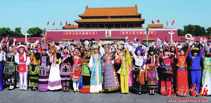 新中國成立以來,黨和國家始終堅持把馬克思主義民族理論同中國民族問題具體實際相結合,始終堅持把民族工作作為一項重大工作來抓,團結帶領全國各族人民共同團結奮斗,共同繁榮發(fā)展,開創(chuàng)了中國特色解決民族問題的正確道路,取得了舉世矚目的成就,積累了彌足珍貴的成功經(jīng)驗。2009年10月1日,在北京天安門廣場,20萬軍民以盛大的閱兵儀式和群眾游行歡慶新中國60華誕,圖為各民族學生參加“團結奮進”方陣群眾游行?!睹褡瀹媹蟆?009年第10期