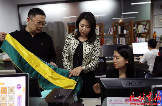 孔麗(中)是來自云南德宏的景頗族,她的公司致力于將少數(shù)民族優(yōu)秀文化與商業(yè)相結合,這是她在與公司員工商議產(chǎn)品設計方案(和勇 攝影)