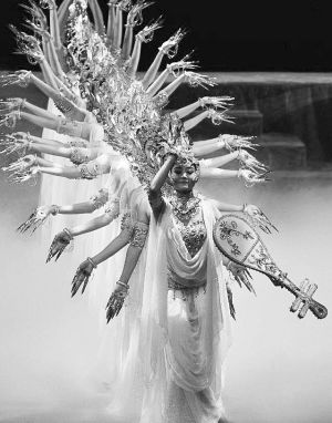 在敦煌舞的動作素材積累方面,無論是對敦煌壁畫舞姿的歸類、整理,對“敦煌舞特有的S型曲線運動規(guī)律”的發(fā)現(xiàn),以及“運用中國古典舞蹈的節(jié)奏韻律,把靜止的姿態(tài)與其風格統(tǒng)一的動作過程結合起來,形成比較完整的舞蹈運動和造型體系”,還是在創(chuàng)作層面上《絲路花雨》對“反彈琵琶”典型壁畫舞姿的發(fā)展,《千手觀音》對“千手”舞姿造型的無限變化發(fā)展,以及《飛天》超越人體動作范圍極限對“三道彎”典型敦煌舞姿風格的強化等,都是敦煌舞在動作素材層面的積極建設和發(fā)展。