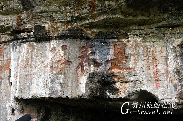 “是春谷”摩崖長20米,高3米,約2萬余字,名為《洗心泉集》,從經(jīng)史集成的詩章共46首,670佘行。所集之書包括易、書、詩、春秋、三禮、四書、孝經(jīng)、爾雅、楚辭、漢、魏、晉、劉宋、南齊、北、周、隋、唐、五代、宋、金、遼、元、明以及時(shí)賢黔宦,黔人等各時(shí)代著名書籍。每字約4,5厘米見方,歐體楷書工整秀麗,為貴州摩崖上乘之作?!鞍灼r春流環(huán)谷水,青山高詠屬宣城?!庇紊酵嫠g,詠此詩句,別有韻味。