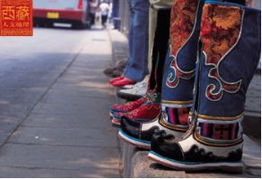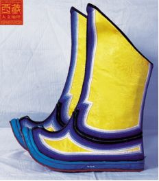 西藏高原地域遼闊,每個(gè)地區(qū)都有屬于自己的鞋子。藏族男女鞋,外觀雖然很像舞臺(tái)上古裝戲里穿的靴子,但用牛皮做底,底高二寸,腰高至小腿之上,鞋面用紅綠相間的毛呢裝飾,鞋腰也有線條、花紋,鞋幫用各色絲線或各色皮革、氆氌、金絲緞制成。人們能從一個(gè)人所穿的鞋子判斷出一個(gè)人的職業(yè)和社會(huì)階層。