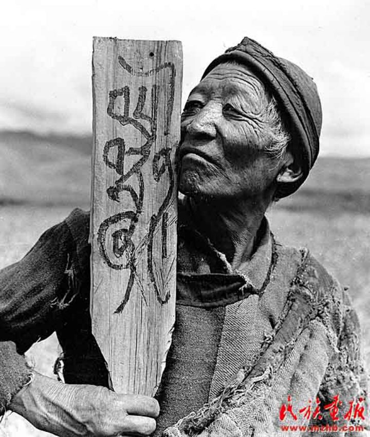 1959年,翻身的農(nóng)奴第一次擁有自己的土地,桑登手里拿著寫(xiě)有“桑登的土地”的木牌久久不愿放下(藍(lán)志貴 攝影)