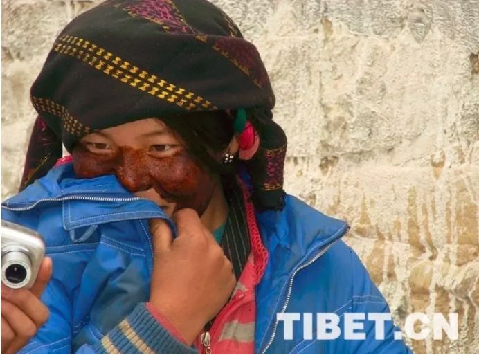 一般情況下,藏北牧區(qū)婦女外出勞作都會(huì)用圍巾將頭部和頸部圍住,這樣既可以保暖御寒又可以抵御強(qiáng)烈的紫外線。而“安達(dá)”可用于涂抹除了眼睛、嘴巴、鼻子外所有臉部區(qū)域。涂抹在臉上的“安達(dá)”自然干了后,婦女們往往會(huì)等到第二天甚至第三天再用溫水洗凈。