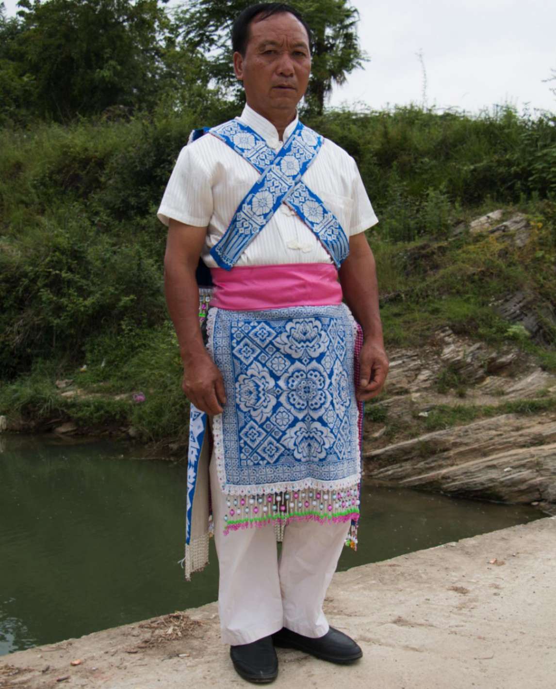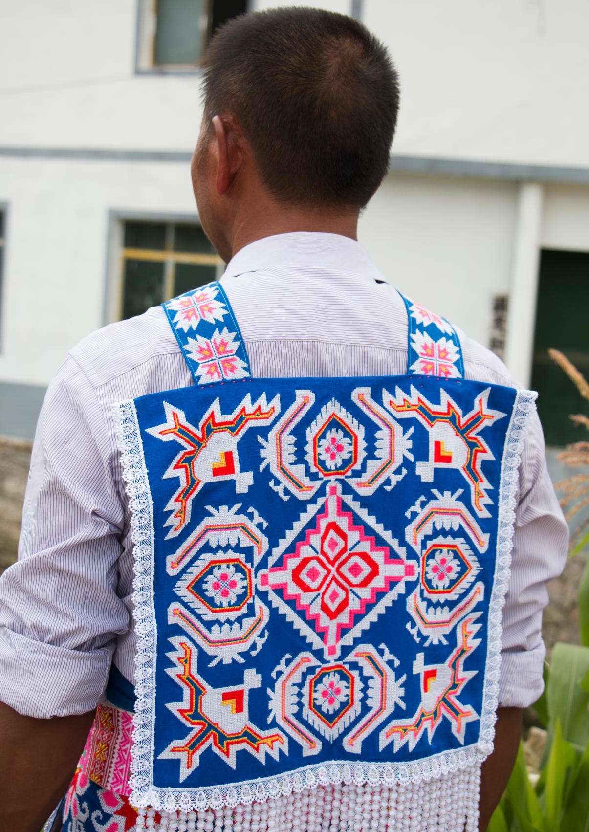 谷立村男子服飾相對(duì)于苗族女子服飾則顯得較為簡樸,男子上身主要穿著白色打底的對(duì)襟衣,身后背有背牌,背牌底色為藍(lán)色,上繡有花朵圖案作為裝飾。下身主要以藍(lán)色打底的圍裙為主,身前圍裙,上面布滿刺繡圖案。身后的圍裙則為一條條獨(dú)立的絲帶,絲帶上同樣布滿花紋刺繡圖案,在其底部還串有珠簾作為裝飾。