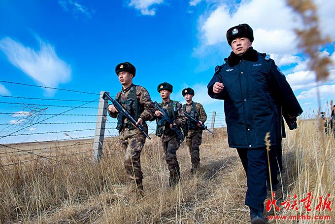 諾門罕布日德邊防派出所副所長敖日奇朗(右一)帶領(lǐng)民警與解放軍邊防連隊聯(lián)合巡邏。