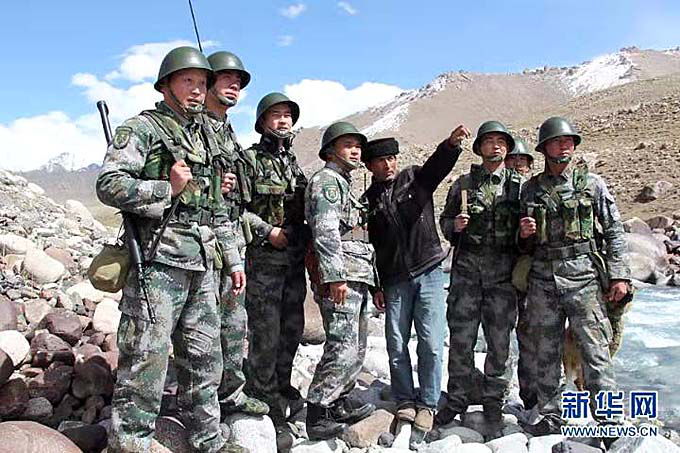 拉齊尼·巴依卡為邊防官兵介紹邊境的山勢地形。(張慶良 攝影)