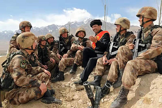 拉齊尼·巴依卡給邊防戰(zhàn)士講戍邊故事。(張慶良 攝影)