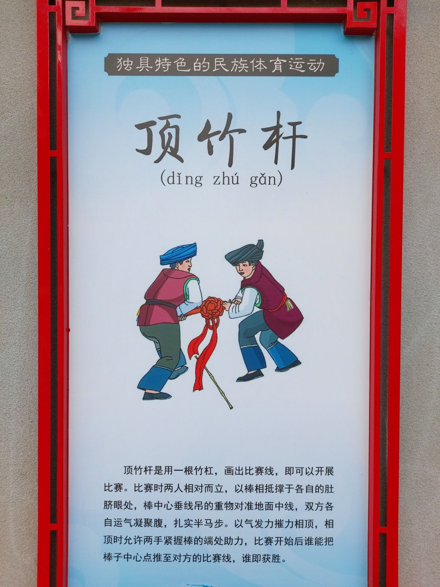 頂竹桿是用一根竹杠,畫出比賽線,即可以開展比賽。比賽時兩人相對而立,以棒相抵撐于各自的肚臍眼處,棒中心垂線吊的重物對準地面中線,雙方各自運氣凝聚腹,扎實半馬步。以氣發(fā)力摧力相頂,相頂時允許兩手緊握棒的端處助力,比賽開始后誰能把棒子中心點推至對方的比賽線,誰即獲勝。