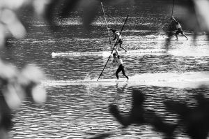 “獨竹漂”又稱“劃竹竿”,運動員赤足站立于一根楠竹上,以小竹竿當(dāng)槳,在水上漂行如履平地,有“一葦渡江”之妙。