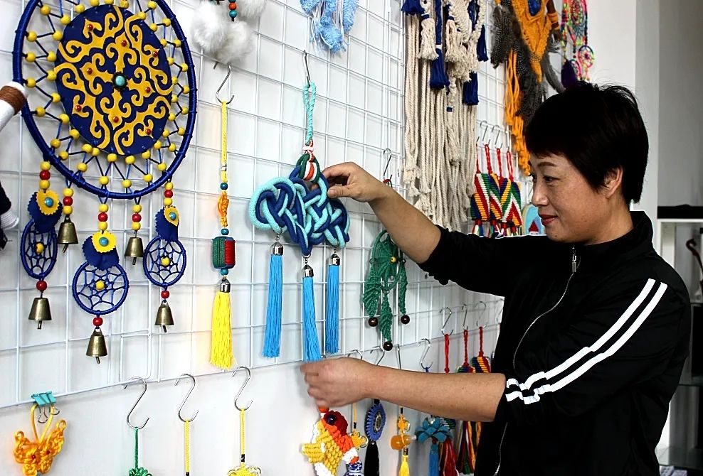 此外,繩結(jié)技藝傳承人把傳統(tǒng)工藝帶去了鄉(xiāng)村,讓傳統(tǒng)手工藝也成為了扶貧的一種助力。她們組織村里的婦女進(jìn)行培訓(xùn)、學(xué)習(xí)。通過(guò)手工藝術(shù)村里的婦女們有了生存的技能,目前大多數(shù)村民及貧困戶(hù)在第一次培訓(xùn)的基礎(chǔ)上,已經(jīng)充分掌握了繩結(jié)技藝,能夠編織出一個(gè)合格的繩結(jié)產(chǎn)品,變成了名副其實(shí)的“巧娘”。她們扶貧村有協(xié)日塔拉嘎查、四方地村等。