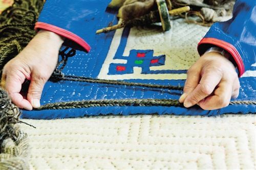 傳統(tǒng)氈繡不僅用于工藝品,大多用在生產(chǎn)生活中。蘇尼特氈繡技藝的繡制首先從制氈開始,大都在夏末秋初進(jìn)行。材料多為駝絨線,而紡駝絨線則是用駱駝膝蓋絨毛以及駝鬣的細(xì)絨手搓而成。