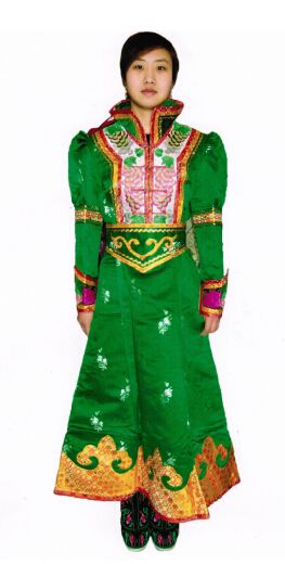 科爾沁蒙古袍款式較合身,長(zhǎng)袍下擺窄且開(kāi)衩。格外注重刺繡裝飾、穿偏開(kāi)襟長(zhǎng)坎肩、工藝精湛的尖頭靴和已婚婦女發(fā)髻式珊瑚頭飾等是科爾沁服飾最顯著的特征。