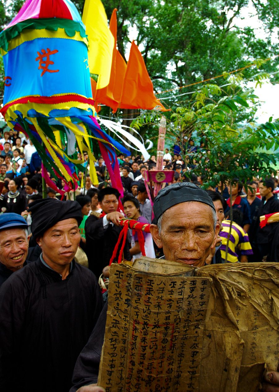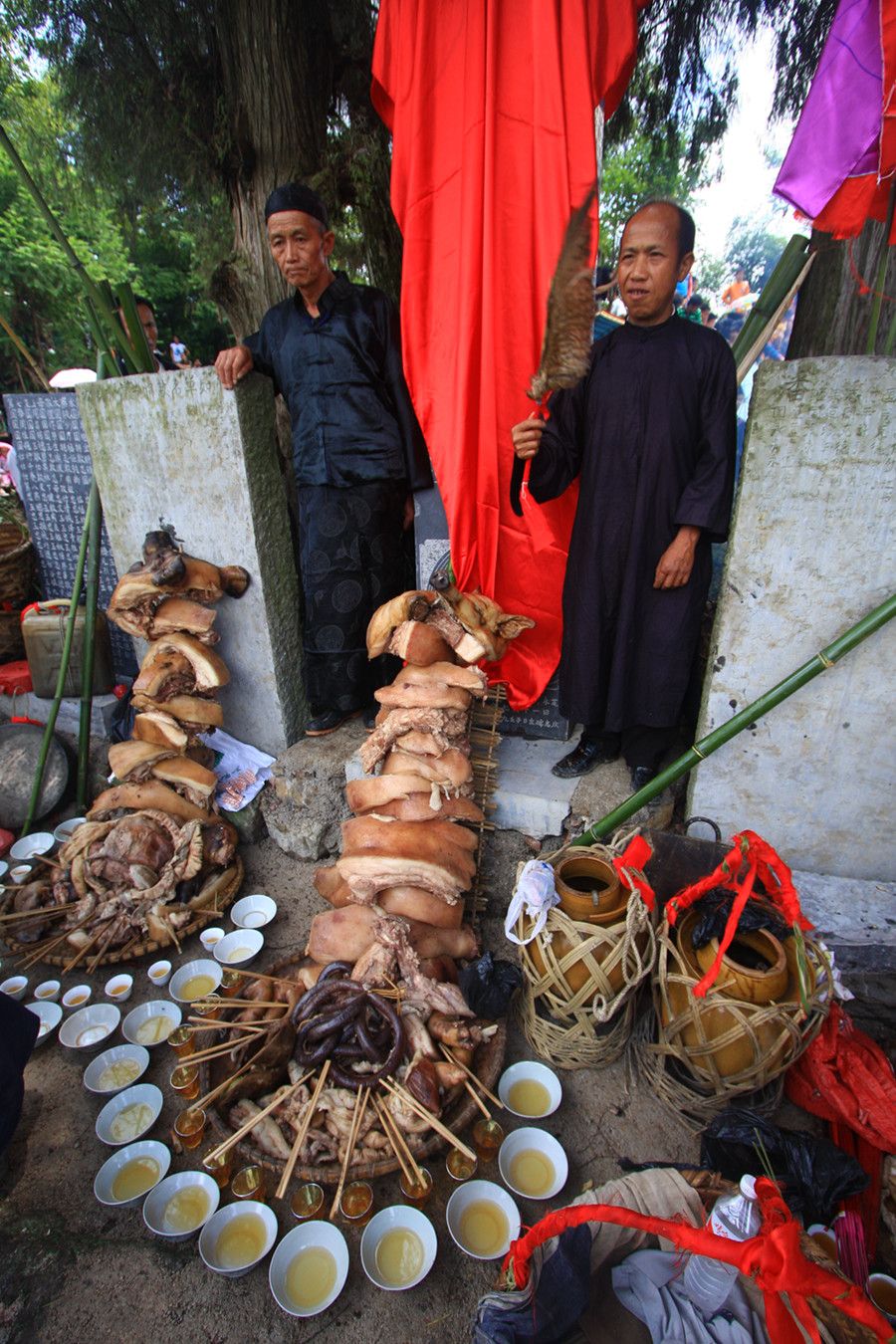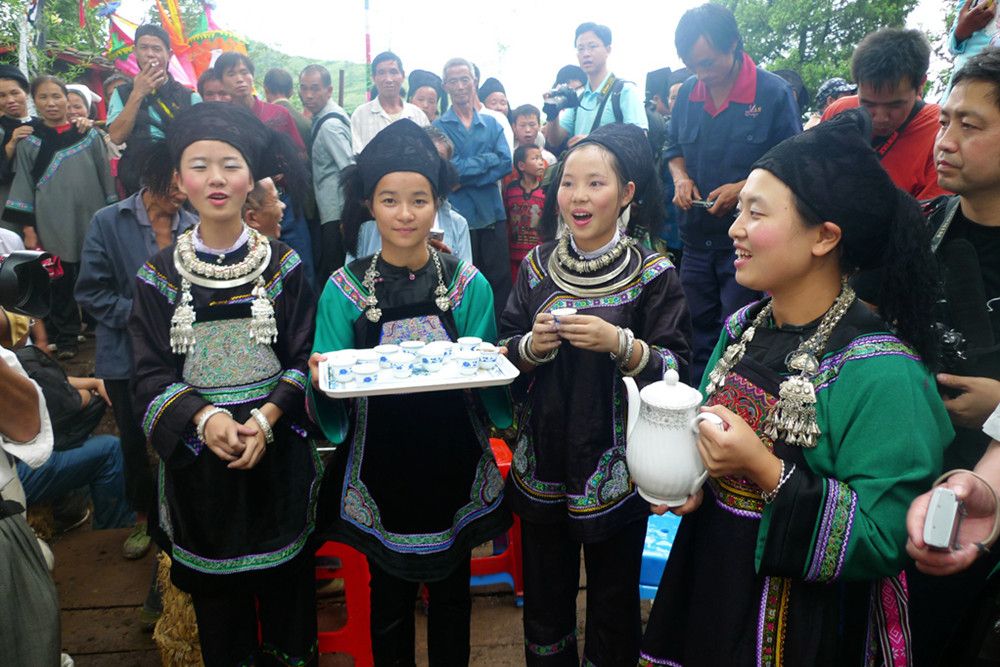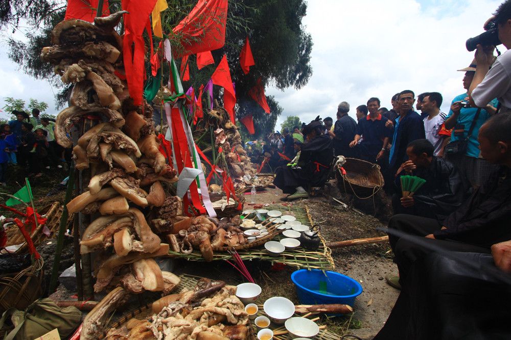 人們傳說只有醉倒了"霞神",它才能永遠(yuǎn)留在這方,才能使這里風(fēng)調(diào)雨順。當(dāng)水書先生念了最后的咒詞,祭典才在鼓樂聲和歡呼聲中結(jié)束。最后,各族系將祭肉一并聚攏,聚餐慶祝。天黑之后,人們秘密地將"霞神"收藏起來(lái),至此,"敬霞"活動(dòng)全部結(jié)束。