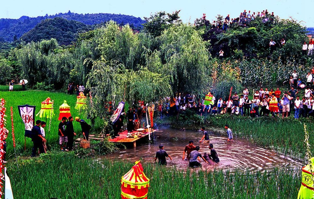 敬霞儀式在霞堂舉行。霞堂設(shè)有祭壇。壇前立著一根竹竿,竿頂上站立一只公雞。祭壇中是主祭席,其友有用松針鋪成十二個(gè)祭祀點(diǎn),由宗族各支系擺設(shè)祭品。敬霞這天,各支系由德高望眾者領(lǐng)隊(duì)。抬著豬肉、糯米飯、米酒等食品列隊(duì)進(jìn)入霞堂。一路上銅鼓、銅鑼、欽、革鼓被敲得冬嚏冬嚓地響,人們跟在后面吆喝著前進(jìn)。祭典開始,鑼鼓暄天。接著由執(zhí)壇的水書先生念讀敬霞的祝詞,內(nèi)容多為祈福禳災(zāi),期冀風(fēng)調(diào)雨順,人壽年豐之類。祝詞之后便酪酒祭之:此后,由兩個(gè)身穿白衣的小伙子抬一母豬到田壩中繞行,后面那位不時(shí)用松針刺戳豬的尾部,使它發(fā)出嗥叫聲。圍觀的人常常發(fā)出哄笑,并且盡情地用竹片屏水和撮稀泥向抬豬者灑淋過去。走過霞堂之后,抬豬者丟下母豬,故意穿進(jìn)圍觀的人群,嚇得人們四處躲避。這種逗趣結(jié)束之后,水書先生再度念讀咒詞,當(dāng)他手中的執(zhí)法彩杖一揮時(shí),飼雞者便學(xué)雞嗚,逗引竹竿頂上的公雞啼鳴。這時(shí),主祭者就向眾人高呼:等待霞神降雨來(lái)沐浴。此后,水書先生再念祝詞,又酹酒祭之。然后由各族系代表抬著"酒壇去澆灌"霞神"。人們用酒從頭澆到腳,一直澆到"霞神"們倒(象征酒醉)才算祭祀的成功。