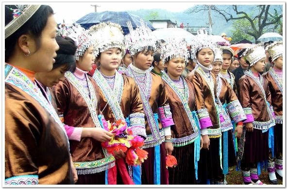 香粉古龍坡會于每年農(nóng)歷正月十六舉行,所以又名“十六”坡。這一天、來自外國朋友、各地的游客及當(dāng)?shù)胤綀A十里的苗哥苗妹,提蘆笙,提鳥籠、牽馬匹,打花傘……朝著十六坡趕來。正午時分,山梁上、村道間、河溪旁,出現(xiàn)了成列成隊穿紅戴綠的人群。遠(yuǎn)遠(yuǎn)望去,似一條彩帶在飄動。當(dāng)萬余人匯集后,整個坡地就成了彩色的世界。