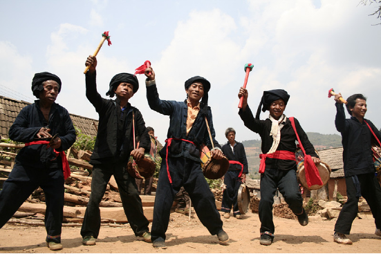 現(xiàn)今的蜂桶鼓直徑一般25—30厘米,高70—80厘米,以攀枝花樹或柳樹挖空樹心,兩端蒙上牛皮制成,形似蜂桶。鼓棒直徑3—4厘米,長(zhǎng)40—50厘米,兩端系有彩色布條。