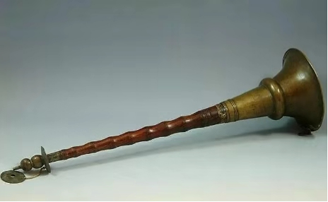嗩吶其實(shí)是由一桿空心黃楊木管,管上鉆7個(gè)洞,管上端安個(gè)蘆葦哨,下端安個(gè)銅喇叭制成的。