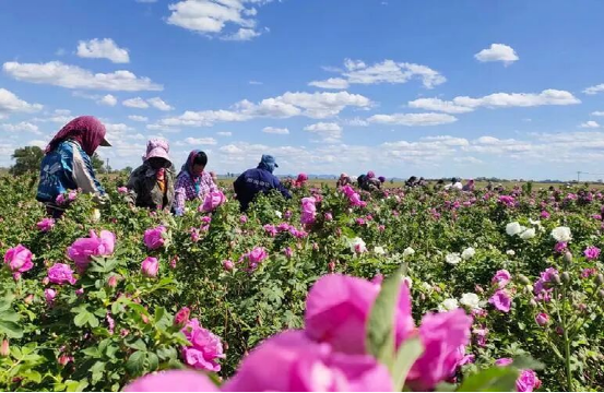 在阿舍鄉(xiāng)清香玫瑰合作社的玫瑰花茶基地里,玫瑰花姹紫嫣紅,爭奇斗艷,美不勝收。為了搶抓玫瑰花采摘最佳時間,花農(nóng)早晨5點(diǎn)多就已經(jīng)忙活起來,他們穿行于花海之間,背著籮筐興高采烈地采摘今年的第一波玫瑰花。