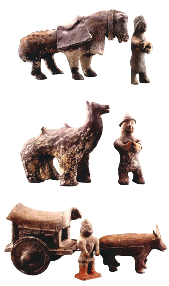 墓內(nèi)隨葬品有陶俑及陶生活器具、家禽及動(dòng)物、牛車等明器。陶俑共15件,有武士俑、男女侍俑、樂(lè)舞俑等。生活器具有灶、磨、燈、罐等。家禽及牲畜類動(dòng)物有豬、犬、雞、羊、馬、駱駝等。