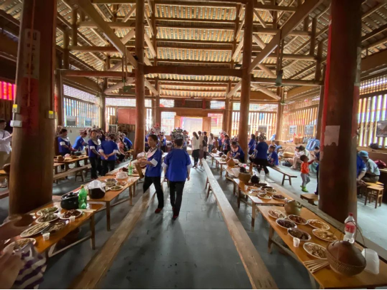 “百家宴”是侗族待客的最高禮儀。每逢村寨互訪或有特別尊貴的客人來時,全村各戶自備酒菜飯,一起到鼓樓坪“一”字型擺開長桌,客人可從第一桌吃到最后一桌,你來我往、觥籌交錯、熱鬧非凡。據(jù)說在當?shù)亓鱾髦@樣一個說法:“吃百家飯、納百家福、聯(lián)百家心、驅(qū)百家邪、成百樣事、享百年壽”——各寨