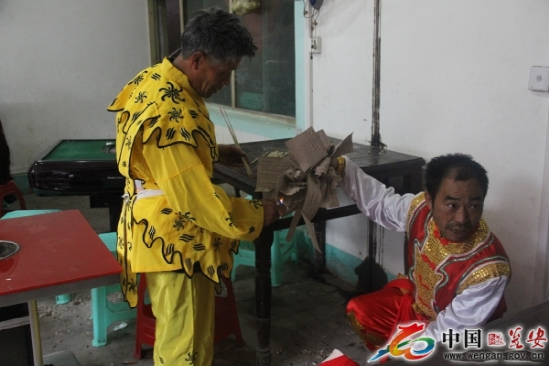 高臺是用5至7張八仙桌一層層疊壘,最上面的桌子四腿朝天,總高度近8米。四人登臺表演。兩個(gè)人扮獅子,把獅頭獅皮披在身上,只露雙腳;另外兩人分別裝扮成孫悟空和笑臉和尚揮舞手帕,大蒲扇逗引獅子逐層攀上高臺,為了穩(wěn)固,安全起見,每張桌子的四角都用草紙疊浸水后墊著防滑,做到萬無一失。