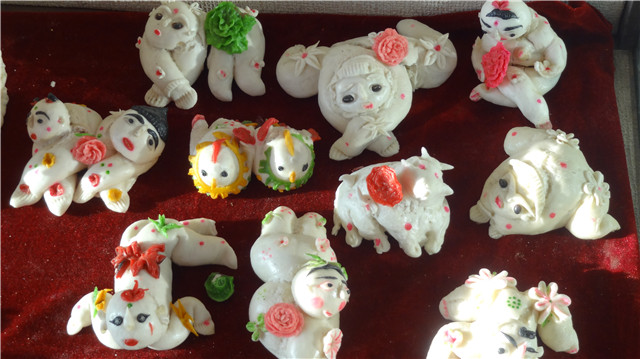 1、春節(jié)(過大年)來(lái)臨前,家庭婦女用白面捏制小狗、小貓、玉兔、魚娃娃、蓮花的面塑制品,上面點(diǎn)綴紅棗、花生等。以象征萬(wàn)事如意,多福多壽、家庭和睦。