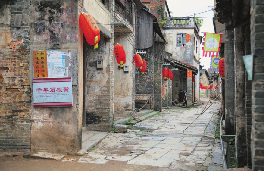 千年老街自北向南,寬約4米、長約300米,青石板路面。沿街多為典型的嶺南風格建筑,二層騎樓,房屋寬敞深長,一樓為鋪,二樓為居,前為店,后為廚。天井頂面多設明瓦數(shù)塊,以取日光照射,木梯扶手、門窗雕刻的粗細花紋無聲地證明它們曾經(jīng)的風采??吹贸霎斈昱f街果然是繁華過的,有飯館,有劇院,有酒肆,有客棧,有百貨,街道排水、布局都很合理,有的街道至今在門前仍有留有水道。