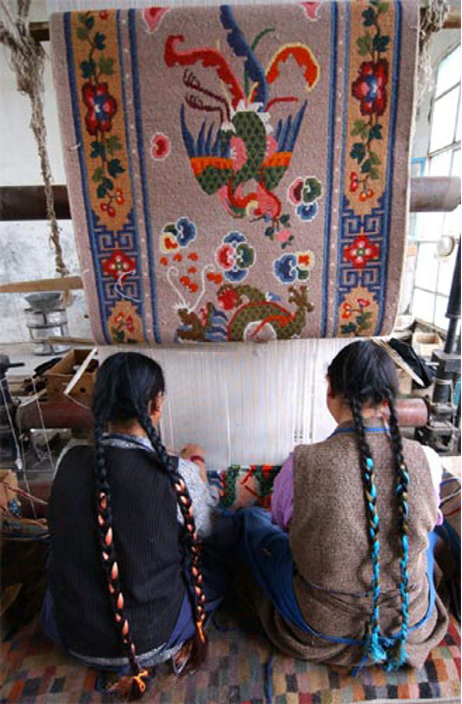 從前,“措巴”每年都要派人去拉薩專為達(dá)賴?yán)锖偷胤秸幙椏▔|以及其他羊毛織品。十三世達(dá)賴?yán)锿恋羌未霑r(shí)期,江孜織工索朗多布杰手藝高超,曾為達(dá)賴?yán)锟椓穗p龍靠墊、凈水瓶袋等著名織品,被封為五品官。民主改革后,江孜卡墊業(yè)在中央政府的關(guān)懷下又有了新的發(fā)展,他們編織的“布達(dá)拉宮”、“珠穆朗瑪”、“萬里長城”等壁毯和地毯,是享譽(yù)國內(nèi)外的精品。