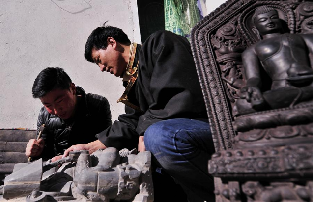 土登加措(右)和他的徒弟在雕刻黑玉石佛像(1月8日攝)。