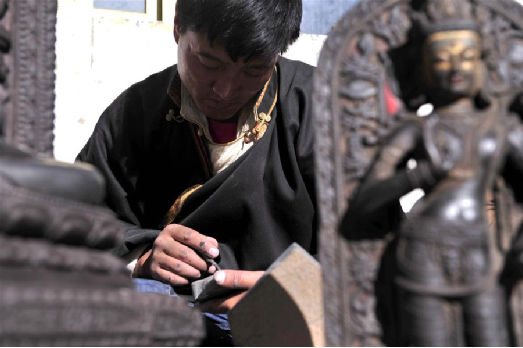 土登加措在雕刻黑玉石佛像(1月8日攝)。