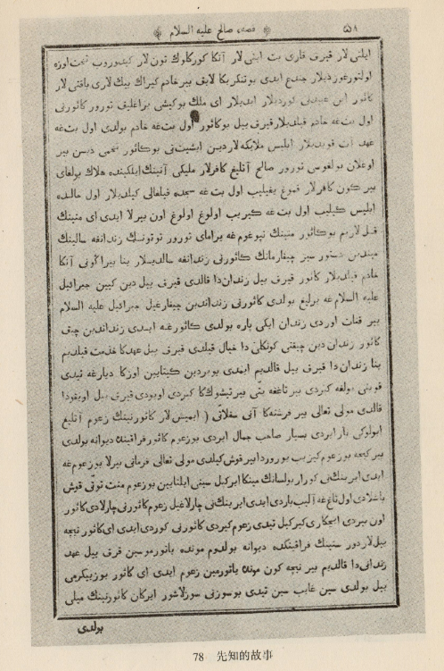 察合臺文著作。1899年喀山大學(xué)鉛印本。高25.5厘米,寬17.5厘米,共510頁。作者拉布古孜,寫于14世紀。圖為《先知薩立哈故事》中的一頁。寫的是異教徒們在魔鬼的支使下將要成為先知薩立哈的父親卡斯瓦爾關(guān)進地牢,天使奉真主之命使他逃出后與妻子見面的故事。現(xiàn)藏新疆博物館。該書語言豐富生動,屬哈喀尼耶語(后期回鶻語)和察合臺語之間的過渡語言,一定程度上反映了當時的口語,是研究維吾爾語言史和文學(xué)史的重要資料。