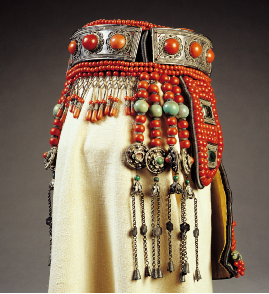 【圖為清代鄂爾多斯珊瑚松石銀牌鏈?zhǔn)⒀b頭飾,中央民族大學(xué)民族博物館館藏】