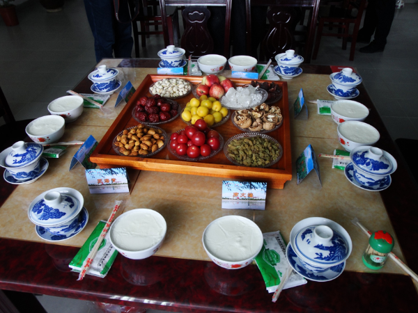 回族普遍喜歡飲茶。回族先民喜食甜品,在中國茶文化影響下,形成了以甜味為特色的飲茶習(xí)慣。飲茶之風(fēng)興起于中國晉代,盛于唐代以后,隨之出現(xiàn)了茶具,其中以包括茶托、茶碗、碗蓋的“三坯胎”蓋碗美觀實用。回族繼承發(fā)展了這種茶文化,形成了以“三炮臺”為茶具的“八寶蓋碗茶”:在茶具中放入茶葉(茉莉花茶、陜青茶、紅磚茶、窩窩茶、毛尖等)、糖(白糖、紅糖、冰糖、梨膏糖等)及紅棗、核桃仁、桂圓肉、芝麻、葡萄干、枸杞(或柿餅、山楂、姜片、果干)等配料,用開水沖制后飲用。茶葉及配料在不同的地區(qū)、不同的季節(jié),根據(jù)飲茶者的身體狀況與喜好有不同的搭配,如“紅糖磚茶”“冰糖陜青茶”“三香茶”(茶葉、糖、桂圓)、“白四品”(陜青茶、白糖、柿餅、紅棗)、“紅四品”(磚茶、紅糖、紅棗、果干)、“五味茶”(綠茶、山楂、芝麻、姜片)等。八寶茶具有生津解渴、開胃健脾的作用,放入不同的茶料,又具備了不同的健身康體功能。