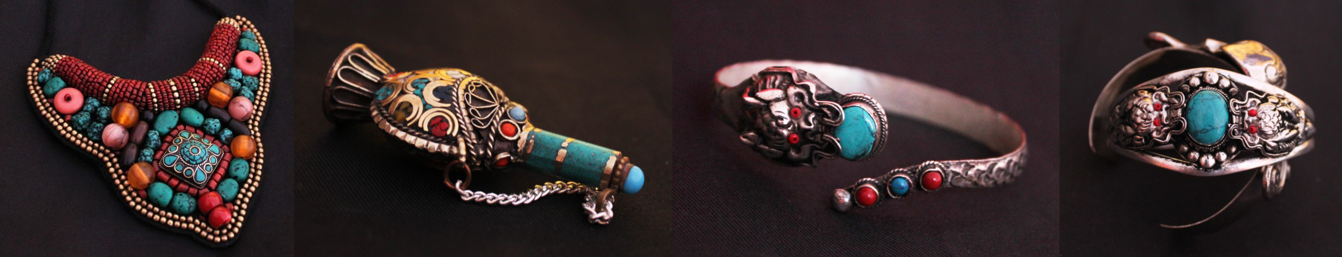 天然石頭、珊瑚、動物骨頭、白銀是制作藏飾的主要原料,就是這些平實的材料,粗糙的外表卻有精致的內涵。細小的花紋、鏤刻、鑲嵌,都巧妙地形式藏飾的設計風格,并散發(fā)出濃烈的古、土味。所有藏飾均是手工完成,好多藏飾是喇嘛在廟里打造出來的,每一件都是與眾不同。